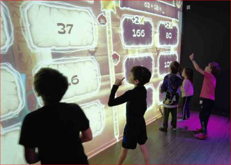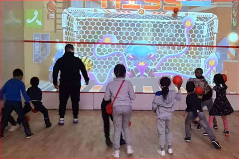 Le projecteur inclus dans la valise à roulettes diffuse sur le mur des images, des vidéos, des animations et c’est là que les joueurs entrent en scène: seuls ou encore mieux par équipes, jusqu’à 8 enfants ou 6 adultes armés de balle et ballons en mousse, qui vont s’affronter en de courtes compétitions, directement en interaction avec l’écran.