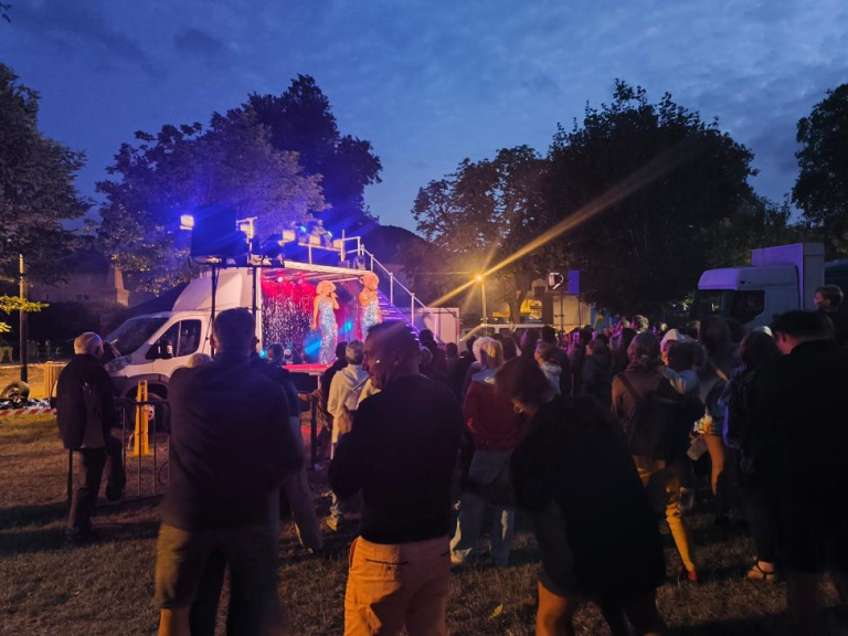 Et c’était reparti pour l’apéritif, les moules et les frites, pour tenir jusqu’au spectacle offert par la Mairie, en alternative au traditionnel feu d’artifice qu’on ne peut plus tirer depuis plusieurs années: trop de vent, trop de sécheresse ou trop de pluie… « Mon truck en plumes » proclamait le néon au dessus du camion-scène-coulisses. Paillettes, jeux de lumières, un spectacle « disco » mené avec entrain. Et ceux auxquels il restait encore un peu d’énergie ont pu profiter du dernier bal….dernier bal de la Saint-Jacques jusqu’à l’année prochaine!