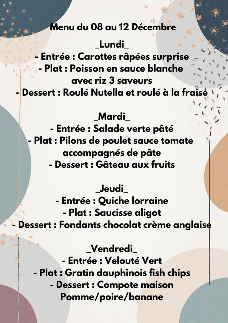 Chaque semaine, les menus servis à la cantine: C’est dans l’onglet « vivre et travailler », cliquer sur Enfance et jeunesse », le menu est sous la présentation de l’école. Dès maintenant, la semaine du 8 au 12 décembre.