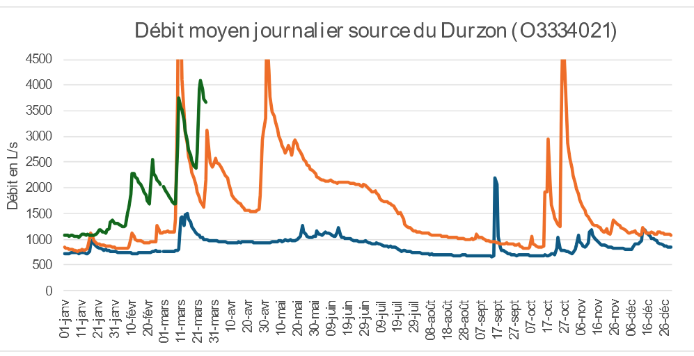 image: relevé des débits sur le Durzon: la courbe de 2025 est en vert